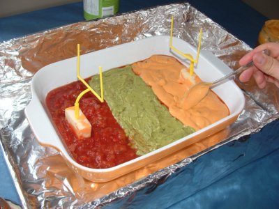 If your using the football cake toppers, use a small block of cheese to hold up the uprights in the end zones. Use the guacamole in the middle to look like the grass. Use the salsa and cheese dip in the end zones to represent the team colors. For each section, use a spoon to smooth out the dip and make the layer even. Using an icing bag filled with sour cream and a Wilton tip #5, make the lines and outline of the field. Then place the remainder of the football players on the field. |